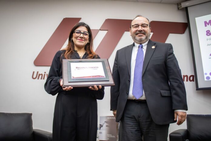 Al término de la presentación, el rector hizo entrega de una placa de reconocimiento a la Mtra. Liliana Díaz de León, por el compromiso mostrado con la comunidad universitaria y por fomentar la participación de las y los jóvenes en los procesos electorales como funcionarios de casilla y como observadores electorales.