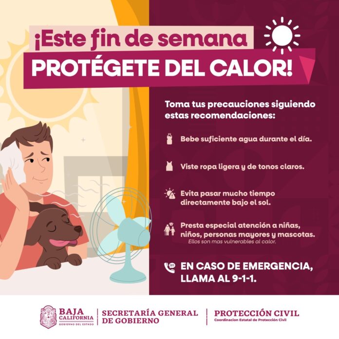 TIJUANA, BC.- La Coordinación Estatal de Protección Civil (CEPC), con base en información del Servicio Meteorológico Nacional (SMN) informa que durante este fin de semana se prevé el aumento de las temperaturas en la región, por lo que exhorta a la ciudadanía a tomar precauciones.