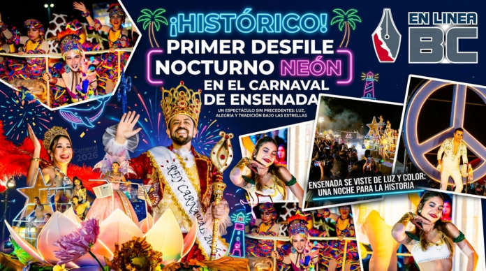 ENSENADA, B. C.- Con un espectáculo de luces neón, música y alegría, en un hecho sin precedentes, se llevó a cabo el primer desfile nocturno de carros alegóricos y comparsas del Gran Carnaval de Ensenada 2026.