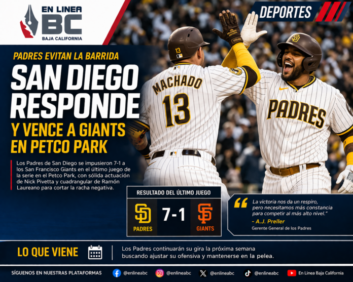 SAN DIEGO, CA.– Los San Diego Padres evitaron la barrida ante los San Francisco Giants al imponerse 7-1 en el último juego de la serie disputada en el Petco Park, en un duelo donde el pitcheo y la ofensiva finalmente respondieron para la novena local.