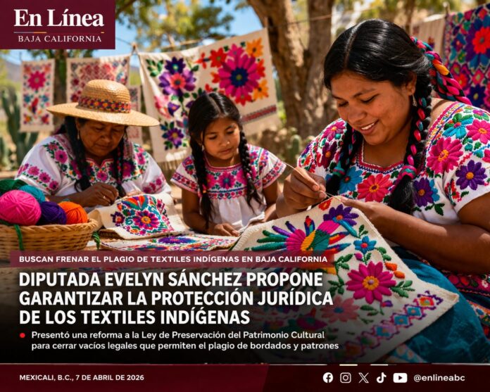Mexicali, Baja California.– Con el objetivo de cerrar vacíos legales que han permitido el plagio y la explotación comercial de los textiles indígenas, la diputada Evelyn Sánchez Sánchez presentó una iniciativa de reforma a la Ley de Preservación del Patrimonio Cultural del estado, con la que busca reconocer y proteger jurídicamente estos diseños como parte del patrimonio cultural de Baja California.