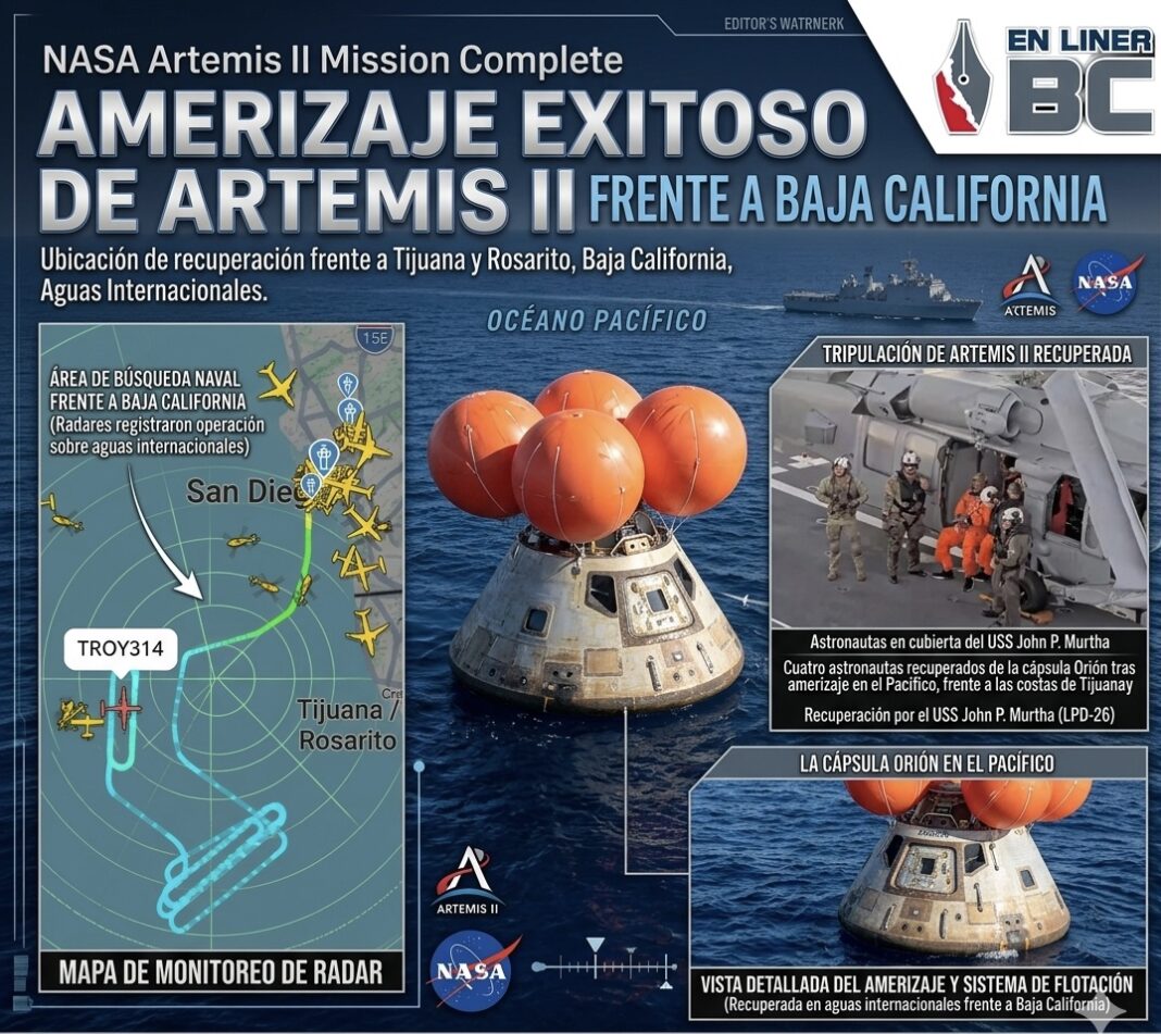 Tijuana.- La cápsula Orión de la misión Artemis II de la NASA completó su regreso a la Tierra este viernes al amerizar en el Océano Pacífico, específicamente en aguas internacionales frente a las costas de Tijuana y Rosarito. Aunque reportes oficiales señalaron San Diego, la operación naval se concentró a la altura de la península de Baja California.