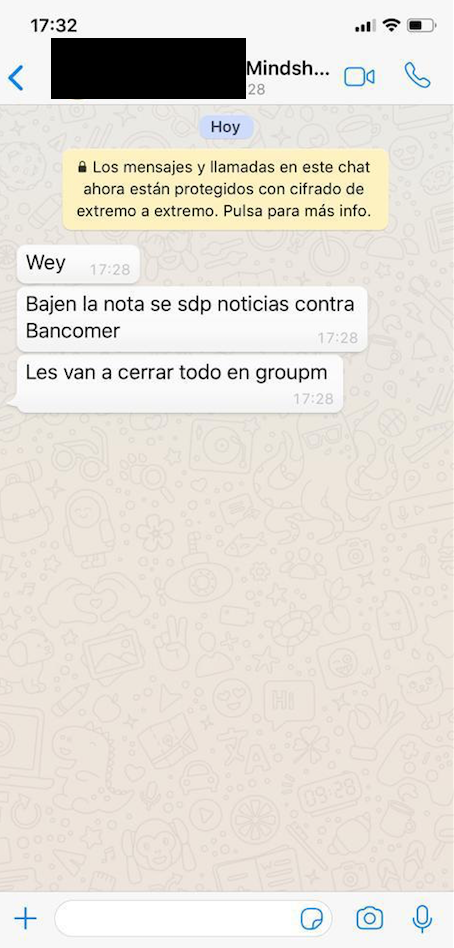 En un mensaje enviado a través de Whatsapp, una representante de Mindshare exigió a un integrante del equipo de SDPnoticias «bajar la nota contra Bancomer», en referencia al reporte de esta tarde que consignó la decisión unilateral de la agencia de suspender el contrato publicitario con este portal por dos artículos de opinión y una nota informativa.