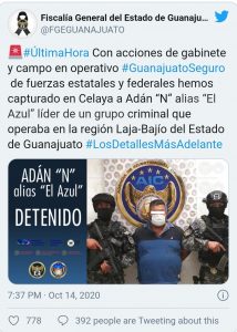 «Con acciones de gabinete y campo en operativo #GuanajuatoSeguro de fuerzas estatales y federales hemos capturado en Celaya a Adán ‘N’ alias ‘El Azul’ líder de un grupo criminal que opera en la región Laja-Bajío del Estado de Guanajuato»