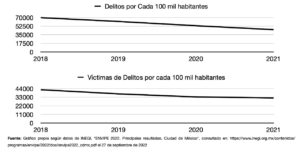 Cabe resaltar los propios resultados de la policía en este periodo, pues el número de delitos por cada 100 mil habitantes en la Ciudad de México disminuyó casi un 35% entre 2018 y 2021, al pasar de 69 mil 716 delitos a un total de 45 mil 336.
