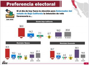 Ante posibles escenarios donde se mide de manera directa los resultados son: MORENA-González Cruz (34%), PAN-Gustavo Sánchez (14%), PRI-Jorge Hank Rhon (14.6%), PRD-Jaime Martínez Veloz (3.8%), MC-Alcibiades García Lizardi (1.2%), el 19% aún no decide y el 13.4% no sabe.
