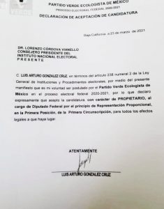 Es postulado por el Partido Verde Ecologista de México, así lo hizo saber el edil con licencia al presidente del INE, Lorenzo Córdova Vianello.