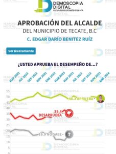 Una encuesta de Demoscopía Digital señala que a enero de 2024, Darío Benítez tenía una aprobación drl 48.2 por ciento de los habitantes de Tecate.
