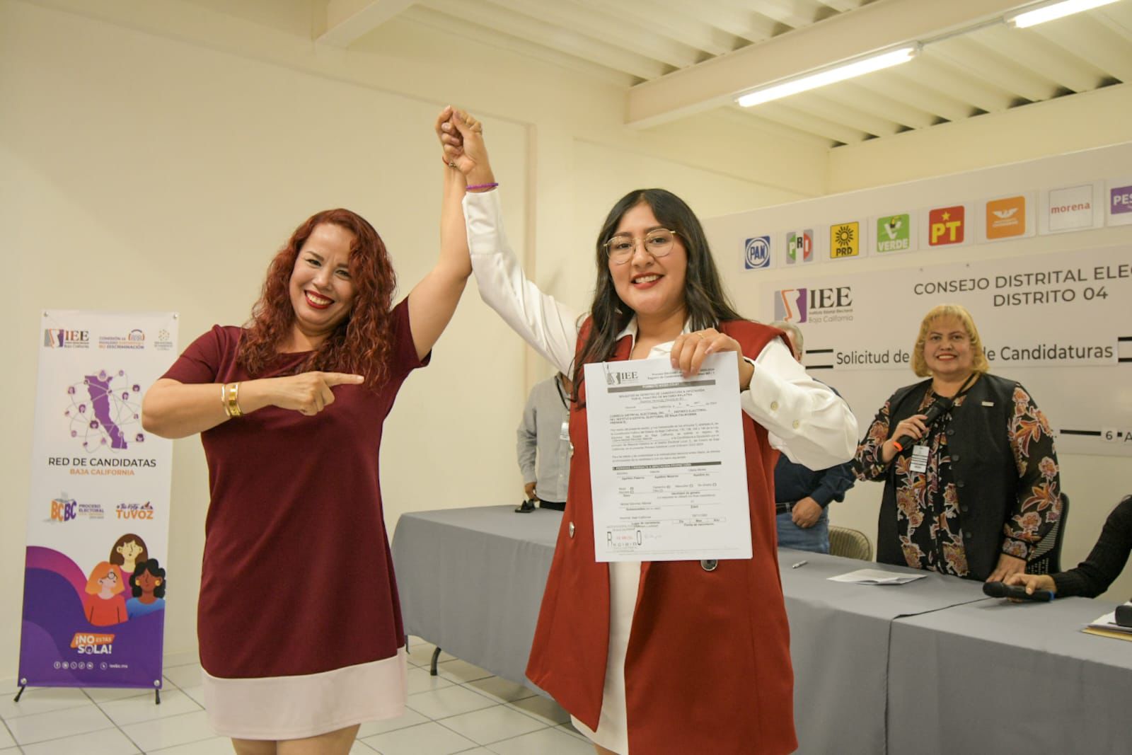 contó con el acompañamiento de familiares, colaboradores, amistades e integrantes de la comunidad del Cuarto Distrito de la capital del Estado, quienes con algarabía ofrecieron su respaldo mediante porras, consignas, pañuelos guindas y leyendas en cartulinas.