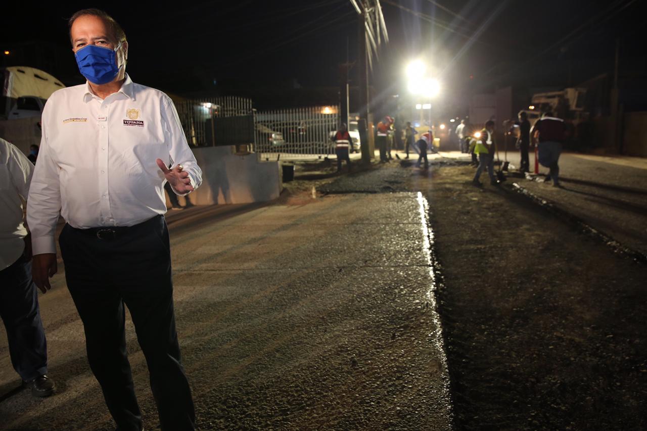 TIJUANA.- Más de 12 mil 800 residentes de la colonia La Gloria serán beneficiados con el bacheo de 150 metros cuadrados que se lleva a cabo en la calle Miguel Hidalgo, como parte de las actividades nocturnas que el XXIII Ayuntamiento de Tijuana, ha implementado para evitar obstruir el tránsito de los ciudadanos que a diario circulan por la zona, labores que fueron supervisadas por el presidente municipal, Arturo González Cruz.