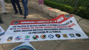 Los policías del estado, en especial de la Fuerza Estatal de Seguridad de Baja California (FESBC), participan como parte del mega contingente, para exigir una reforma al Artículo 123 BXII, igualdad y justicia laboral, el derecho a la sindicalización policial y jubilación a los 25 años de servicio policial.