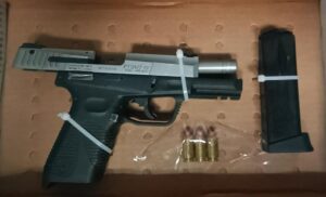 Fueron sorprendidos con un fusil de asalto calibre .223 qué se encontraba abastecido con 15 cartuchos útiles, un cargador adicional con 3 tiros, y una pistola calibre .45 abastecida con 3 balas.