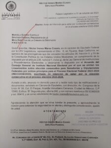 Mediante una carta entregada a Marcela Guerra Castillo, presidenta de la Mesa Directiva de la Cámara de Diputados de la LXV Legislatura Federal, el Diputado por MORENA, dijo que “opta por la elección consecutiva en el proceso electoral del periodo 2023-2024”.