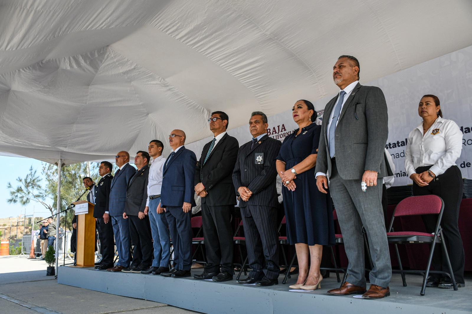 La ceremonia contó con la presencia de diversas autoridades, entre ellas el Coordinador de Gabinete de la Fiscalía General, Juan Carlos Buenrostro Molina, quien asistió en representación de la Fiscal General Ma. Elena Andrade Ramírez. También participó el Secretario de Seguridad Estatal, General Leopoldo Tizoc Aguilar Durán, quien encabezó la ceremonia, junto a representantes de seguridad de los municipios de Tijuana, Mexicali, Rosarito, Ensenada, San Felipe y San Quintín.