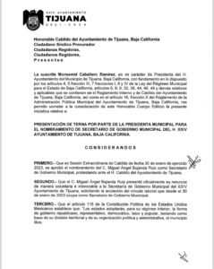 TIJUANA.- La alcaldesa de Tijuana, Montserrat Caballero Ramírez, convocó hoy a sesión de Cabildo para votar la terna de secretario General de Gobierno que encabeza el regidor José Refugio Cañada.