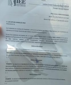 MEXICALI.- El Instituto Estatal Electoral de Baja California (IEEBC) desestimó las presuntas faltas cometidas por parte del Alcalde de Tijuana, Luis Arturo González Cruz, relacionadas con el presunto uso indebido de recusos públicos para la promoción personalizada del titular del XXIII Ayuntamiento de Tijuana. Lo anterior está registrado en el Oficio número IEEBC/CGE/4748/2021 dirigido al Presidente Municipal.