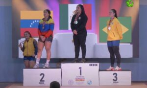 En el total, la medalla de bronce fue para la brasileña Layla Rocha con 213, metal que también consiguió en arranque con 100; Ivanna Cerquera con 122 kilos en envión subió al podio a recibir el metal de plata.